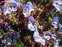 Salvia chamelaeagnea is a species of flowering plant in genus Salvia, known as sages. It is endemic to South Africa, where it grows on the western coastline of the Cape of Good Hope. It is a shrubby perennial herb up to 6 feet (1.8 metres) tall and 4 feet (1.2 metres) wide. It bears three-quarters-inch (two-centimetre) light violet-blue flowers with pale lower lips and white throats. The small, green leaves release a slight medicinal odor when brushed. In the wild, the plant grows in sandy soil in streambeds, open fields, and roadsides. It is cultivated for gardens.[1]