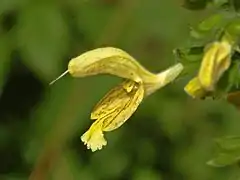 Flowers grow in whorls of two to six, with pale yellow flowers speckled with maroon.[2] The flowers are supported by tiny persistent bracts and have a length of 3–5 centimetres (1.2–2.0 in), which is quite big for a sage. The flowers have two stamens and a bell-shaped calyx. The flowering period extends from June to September.[1]