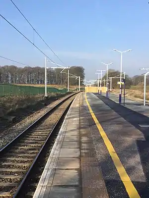 The modernisation and electrification of the Preston to Blackpool North line, and hence the station, was announced in December 2009.[5] The modernisation included rebuilding and raising the road bridge in the station vicinity for necessary electrification clearance and completely new signalling of the entire line[6] along with rationalisation of the lines and removal of the spur into the nuclear facility nearby. The removal of the signal box along with four others along the line was included as part of the works.[7][8] This resulted in a total blockade of the line as far as Kirkham and thus including Salwick station from 11 November 2017 until 29 January 2018.[9][10]