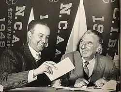 In 1929, the University of Southern California in Los Angeles was in need of a new basketball coach, and Jones—at USC since 1925—recommended his old colleague for the position. Barry followed Jones out west, and took over the USC basketball program as well as the baseball team, while also resuming his duties as an assistant football coach under Jones. Barry's Trojan basketball teams won Pacific Coast Conference titles in 1930, 1935, and 1940—along with eight southern division titles between 1930 and 1940—and conference crowns in baseball in 1930, 1932, 1935, 1936, 1939, 1946, 1947, 1948, and 1949. In 1940, the USC basketball team was widely considered to be the best in the nation, and participated in the nascent NCAA tournament, but they lost their bid for the national title when they were upset in the national semifinal at Kansas City, against Kansas, when the son of opposing coach, Phog Allen, made a basket with seconds left for a one-point victory. Despite the loss, the Helms Athletic Foundation later retroactively selected USC as the 1940 national champions.