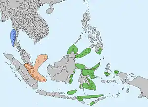 Most subgroups of Sama-Bajau name themselves after the place they originated from (usually an island).[27][30][33] Each subgroup speaks a distinct language or dialect that are usually mutually intelligible with their immediate neighbouring subgroup in a continuous linguistic chain.[33] In the Philippines, the Sama-Bajau can be divided into three general groups based on where they settle:[17][31]