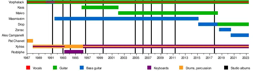 The current line up of the band include founding members and brothers Vorphalack (Vorph) and Xytraguptor (Xy), guitarist Drop and bassist Ales. A few other members have been part of the band throughout the years: Rodolph H. (keyboards, 1993–1995), Kaos (guitar, 1996–2001), Mas (bass, 1991–2014) and Makro (guitar, 2002–2018).