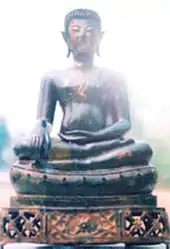 Buddha statue: "Phra Phutthamani Maitri Rattana" (Thai: พระพุทธมณีไมตรีรัตนะ, "the jewel Buddha of precious friendship"). Formerly, it was untitled but called "Phra Phuttharup Chiang Saen Sing Sam" (th: พระพุทธรูปเชียงแสนสิงห์ 3, "Chiang Saen's Three Lions Buddhist Statue). On 1 July 2004, Somdet Phra Nyanasamvara, the Supreme Patriarch of Thailand) gave it its present name to celebrate the school's centenary in 2008. The statue is bronze, dating back around 400–500 years to the Chiang Saen period. Having a size identical to a mature child sitting in a meditative posture, its length is 17 inches. Three lions mentioned in the name are the artistic features of the statue: lion-like feature, divine-like feature, and Buddha-like feature.[7] Presently, it is installed in Building 1's auditorium as the principal Buddha statue.