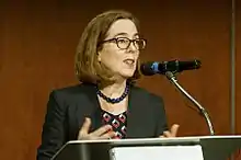 Minutes after the decision was announced at noon, officials in at least four counties were fulfilling requests for marriage licenses from same-sex couples. The first to wed in Multnomah County were two of the plaintiffs, Deanna Geiger and Janine Nelson.[41] That county issued 96 licenses the first day, and judges officiated at wedding ceremonies in a Portland ballroom.[42][43][44] Governor John Kitzhaber, the named defendant, said "I strongly support Judge McShane's decision to overturn institutional discrimination in Oregon's constitution. No longer will Oregonians tolerate discrimination against the gay, lesbian, and transgender community. [...] Now, finally, all Oregonians will have the opportunity to make a legal commitment to the person they love. Every person and every family in Oregon deserves that chance. Today is a win for love, for families, and for freedom." Senator Jeff Merkley called it "a historic day for Oregon", and Senator Ron Wyden said, "Judge Michael McShane's decision marks a significant moment in Oregon's civil rights history, and it's an important step toward equal rights for all Americans. Every American deserves the freedom to marry the person they love, and, starting today, all Oregonians will have that choice. I am proud to have stood with Oregon's same-sex couples in this struggle for marriage equality for nearly 20 years, and it's important to keep pushing until that right extends to all Americans." The Republican House leader, Mike McLane, issued a statement, "For those that believe marriage is a religious covenant, the origin of which predates America, today's federal court ruling won't change that. For those that believe marriage is a legal union between two people that is recognized and enforced by our state government, today's ruling is a logical extension of the Supreme Court's ruling last summer. Our society must embrace both views. My hope is that the process of reconciliation in Oregon will continue as we move forward with respect for each other." Val Hoyle, the Majority Leader of the House, said "I married the person who I love over 22 years ago, and I'm thrilled that all Oregonians now have the freedom to do the same."[45]