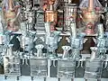Kashmiri samovars are made of copper with engraved or embossed calligraphic motifs. In fact in Kashmir, there were two variants of samovar. The copper samovar was used by Muslims and that of brass was used by local Hindus called Kashmiri Pandit. The brass samovars were nickel-plated inside.[13] Inside a samovar there is a fire-container in which charcoal and live coals are placed. Around the fire-container there is a space for water to boil. Green tea leaves, salt, cardamom, and cinnamon are put into the water.[14]