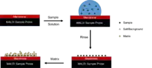 The concentration of salt in the sample is a factor that needs to be considered when preparing a MALDI sample as well. Salts can aid a MALDI spectra by preventing aggregation or precipitation while stabilizing the sample. However, interfering signals can be observed due to side reactions of the matrix with the sample, such as in the case of the matrix interacting with alkali metal ions which can impair the analysis of the spectra. Typically the amount of salt in the matrix only becomes a problem in very high concentrations, such as 1 molar.[23] The problem of having too high a concentration of salt in the sample can be solved by first running the solution through liquid chromatography to help purify the sample, but this method is time-consuming and results in the loss of some of the sample to be analyzed. Another method is focused on purification once the sample solution is deposited onto the sample probe. Many sample probes can be designed to have a membrane on the surface that can selectively bind the sample in question to the probe surface. The surface can then be rinsed off to remove all unnecessary salts or background molecules. The matrix of appropriate salt concentration can then be deposited directly onto the sample on the probe surface and crystallized there.[23] Despite these negative effects of salt concentration, a separate desalting step is usually not necessary in the case of proteins, because the selection of appropriate buffer salts prevents the occurrence of this problem.[27]