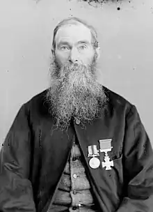 The following year, Austin was nominated by Keepa for an award of the New Zealand Cross (NZC) for his service during the campaign in the Taranaki and the fighting against Te Kooti.[30] The NZC was instituted in 1869 to recognised acts of gallantry performed by the country's colonial military forces and four years later, nominations were invited for scrutiny by a commission.[31] Keepa's efforts to have Austin receive the NZC were supplemented by Major McDonnell, who wrote to the Secretary of Defence explaining the events that occurred at Keteonetea. Chute, who had witnessed Austin's actions at Pūtahi pā where he had rescued McDonnell under fire, also wrote in support. On 15 May 1876, the award was approved by George Phipps, the Governor of New Zealand.[30] The citation for Austin's NZC, published in the New Zealand Gazette, read: