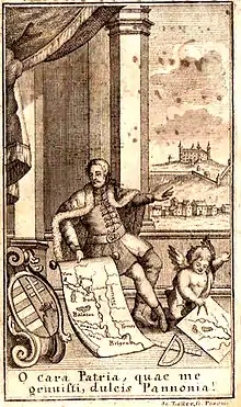 In the literature, Mikoviny is mentioned as a Slovak polymath (the first Slovak engineer)[3][4][5][6] and also as a Hungarian.[7][8] The contemporary elites identified themselves as members of common Natio Hungarica regardless of their ethnic origin, whereas the contemporary term Hungarus is an umbrella term covering ethnic Hungarians (Magyars), Slovaks and other ethnic groups in the Kingdom of Hungary because the self-definition through a common homeland, class or religion was more common than through language. The Slovak origin of Mikoviny was noticed already by Ján Kollár and is supported by further research in present-day Slovakia. Besides another, the research in local archives confirmed that the father of Sámuel Mikoviny wrote his records in Turíčky (Turicska) in Slovak.[3] Mikoviny declared himself in more of his maps and works as "nobilis Hungarus".[9][10] Two letters written in Hungarian remained after him,[11][10] however - as per the contemporary customs - by his studies and works mostly he used the German and the Latin language.[10]