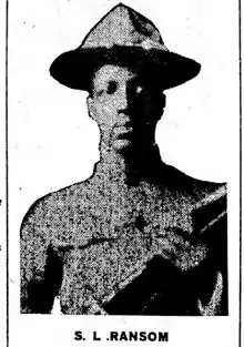 Ransom enlisted and joined the 8th Illinois Regiment of the National Guard in July 1917.[4] When he left St. Paul, the Minnesota Club where he worked threw a large party, and the patrons raised $550 and he was presented a soldier's silver wrist watch with an inscription, "From John Jackson and Sherman Finch to S.L. Ransom." The newspaper also noted that since Ransom "neither drinks, smokes, nor chews and in (reality) has no bad habits, the money will not be wasted in riotous living."[4]