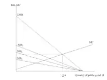 where is the marginal benefit to each person of consuming one more unit of the public good, and MC is the marginal cost of providing that good. In other words, the public good should be provided as long as the overall benefits to consumers from that good are at least as great as the cost of providing it (public good]]s are non-rival, so can be enjoyed by many consumers simultaneously).