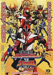 Samurai Sentai Shinkenger vs. Go-onger: GinmakuBang!! (侍戦隊シンケンジャーVSゴーオンジャー 銀幕BANG!!, Samurai Sentai Shinkenjā tai Gōonjā Ginmakuban, [Note 1]) is a Japanese superhero film released in theaters on January 30, 2010, featuring a crossover between the Samurai Sentai Shinkenger and Engine Sentai Go-onger casts and characters. The heroes of Tensou Sentai Goseiger also make a cameo appearance in the film.[1] The catchphrase for the movie is "Two Sentai! On the Road of Justice, Go Forth!!" (2大戦隊! 正義のロードへ、いざ参る!!, Nidai sentai! Seigi no rōdo e, iza mairu!!). It opened at #5 its opening weekend and earned the equivalent of US$5 million.[2] Its footage was used for the Power Rangers Samurai team up episode "Clash of the Red Rangers - The Movie".