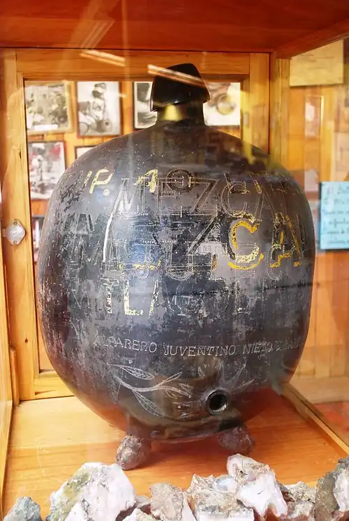 For almost all of the town's history, the color of the local pottery was a dull dark gray, until Doña Rosa Real discovered a way to create a shiny black finish commonly known as barro negro pottery.[4] The innovation made the pottery more popular and famous, with Nelson Rockefeller having a collection of her pieces.[12] Doña Rosa died in 1980, but the tradition of making the barro negro pottery is being carried on by Doña Rosa's daughter and grandchildren who stage demonstrations for tourists.[4] The workshop is still in the family home, where shelves and shelves of shiny black pieces for sale line the inner courtyard.[13] Despite being the origin of black polished clay, the pieces at the Doña Rosa Workshop are less expensive than in other parts of Mexico.[14]