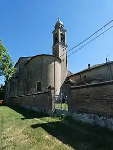 "Terreni Novi" (English: New Land), i.e. today's frazione of San Bernardino, was among the first belongings of the House of Gonzaga to be reclaimed between the 15th and 16th centuries. This was possible after the impoundment of the swamps occupying the area.[2] At the end of the 15th century, Francesco I started the construction of two big houses, called "Costanze" in honour of his wife Costanza Strozzi.[3] During the following century, the first church dedicated to Bernardino of Siena was erected at the behest of Alessandro I.[4] Around 1580, a new house, Cascina Vittoria, was built, named after Vittoria di Capua, wife of Alfonso I Gonzaga. The Gonzaga family often visited San Bernardino to hunt pheasants, partridges and quails. One of the first written sources on "Terreni Novi" is about the production of cheese. Giulio Cesare Gonzaga, in 1529, hired Lorenzo and Antonio Busi, sons of the jew Giarono, and rented a farmhouse, with 140 cows and extended grasslands to produce Parmesan cheese. Furthermore some tools are mentioned, such as "cauldrons, skimmers, wooden moulds, and wooden boards for cheese".[5]