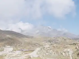 San Bernardino Pass (Italian: Passo del San Bernardino, German: Bernhardinpass, 2,066 metres (6,778 ft)) is a high mountain pass in the Swiss Alps connecting the Hinterrhein and the Mesolcina (Misox) valleys between Thusis (canton of Graubünden) and Bellinzona (canton of Ticino). Located in the far eastern side of the Western Alps it is not to be confused with the Great St Bernard Pass and the Little St Bernard Pass. The top of the pass represents both the Italo-German language frontier and the watershed (drainage divide) between the Po basin and the Rhine basin. Marscholsee is within the pass at an elevation of 2,053 m (6,736 ft).