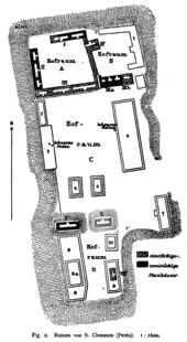 San Clemente was one of the most important Maya cities in the region immediately to the southwest of Yaxha;[6] the site core covers an area of approximately 60,000 square metres (650,000 sq ft) and includes an acropolis,[7] and two ballcourts, which are oriented north-south.[8] The architecture of San Clemente is grouped into three principal sectors, the northern sector labelled the Palace, the central sector consisting of the Main Plaza, and the Elevated South Group.[9] The three architectural groups are aligned upon a north-south axis.[10] There are examples of range-type structures at San Clemente with masonry pillars supporting the facade.[11] Structures were numbered by early investigators from north to south.[12] The site core was accessed by a causeway that approached from the east to join the Main Plaza.[10]