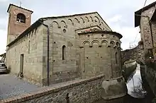 The present church at the site was built between the 11th and 12th centuries at the site of an earlier 9th century church,. The ceramic decoration in the apse dates from this latter construction. The layout is that of a Latin cross with three naves, each with a semicircular apse. A bell-tower rises alongsides. A refurbishment occurred in the 16th century, with the insertion of side altars.[1]