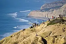The city lies on approximately 200 deep canyons and hills separating its mesas, creating small pockets of natural open space scattered throughout the city and giving it a hilly geography.[63] Traditionally, San Diegans have built their homes and businesses on the mesas, while leaving the urban canyons relatively wild.[64] Thus, the canyons give parts of the city a segmented feel, creating gaps between otherwise proximate neighborhoods and contributing to a low-density, car-centered environment. The San Diego River runs through the middle of San Diego from east to west, creating a river valley that serves to divide the city into northern and southern segments. During the historic period and presumably earlier as well, the river has shifted its flow back and forth between San Diego Bay and Mission Bay, and its fresh water was the focus of the earliest Spanish explorers. Miguel Costansó, a cartographer, wrote in 1769, "When asked by signs where the watering-place was, the Indians pointed to a grove which could be seen at a considerable distance to the northeast, giving to understand that a river or creek flowed through it, and that they would lead our men to it if they would follow."[65][66] That river was the San Diego River.[65] Several reservoirs and Mission Trails Regional Park also lie between and separate developed areas of the city.