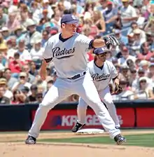 On April 15, 1997, exactly 50 years after Jackie Robinson broke the baseball color line, the No. 42 he wore with the Brooklyn Dodgers was retired throughout major league baseball.[40][45] Later that year, Randy Jones's No. 35 was retired by the Padres. He was a two-time All-Star (1975, 1976) and the club's first Cy Young Award winner in 1976.[46] On the day his number was retired, the Union-Tribune wrote that Jones was "the most popular athlete in the history of this city" during the mid-1970s.[47] Dave Winfield was next to have his number, 31, retired in 2001, when he was also inducted into the Baseball Hall of Fame. His retirement ceremony also celebrated his decision to be the first member of the Hall of Fame to have his plaque depicting him wearing a Padres cap. Winfield played for six teams in his 22-year career, spending his first eight seasons in San Diego.[48][49] In 2004, the Padres retired No. 19 in honor of Gwynn, who is widely considered the greatest Padres player ever.[35][50] He played his entire 20-year career with San Diego and won an NL-record eight batting titles.[35] The most recent number to be retired was Trevor Hoffman's No. 51 in 2011. He had retired from playing after 2010, when he left the game as MLB's career leader in saves with 601, including 552 with the Padres.[51]