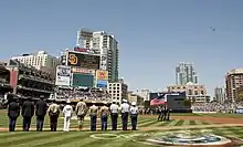 In 1996, the Padres became the first national sports team to have an annual military appreciation event.[19] In 2000, the Padres began wearing a camouflage jersey to honor the military. The jersey is now in its seventh iteration.[20][21][22] Starting in 2008, the Padres began wearing camouflage jerseys for every Sunday home game. They also wear these uniforms on Memorial Day, Independence Day, and Labor Day. For 2011, the Padres changed the camouflage design to a more modern "digital" design, using the MARPAT design after receiving permission from then-Commandant James Conway,[20] and dropped the green from the lettering and logo of the jersey. Green was replaced by a sand-olive color (also in the cap worn with the jersey). For 2016, to coincide with hosting the 2016 Major League Baseball All-Star Game, the Padres changed the camouflage jersey once again; this time to navy blue, however, this design was only worn for one season as for 2017, the Padres switched the camouflage jersey to Marine, which was used through 2019. For 2020, the Padres will begin using two different camouflage jersey colors: green and sand-olive, both with the current Padres wordmark. Since 1995[23] Marine Recruits from the nearby Marine Corps Recruit Depot often visit the games en masse during Military Appreciation Day, in uniform, often filling entire sections in the upper deck of Petco Park. When they are present, the team commemorates this with a special Fourth Inning Stretch featuring the Marine Hymn played by stadium organist Bobby Cressey.[24] Through April 2005 over 60,000 marine recruits were hosted by the Padres.[25] This is part of an extensive military outreach program, which also includes a series of Military Appreciation Night games,[26] and game tapes mailed to deployed United States Navy ships of the Pacific Fleet for onboard viewing (a large portion of the Pacific Fleet is homeported in San Diego).[27][28][29] Now, every Sunday home game the Padres play is "Military Sunday", where they wear their camouflage uniforms instead of their normal brown-and-yellow uniforms.