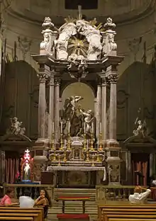 The layout is that of a Latin cross. The masterpiece inside the church is the main altar's sculptural group depicting the Liberated Slaves by Giovanni Baratta, depicting an angel with one liberated and one still chained slave.[1]