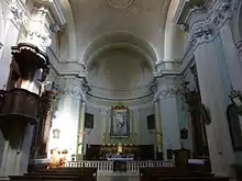 While the exterior is simple unfinished brick; the interior was refurbished in Baroque fashion. The flanks of the church have buttresses. The bell-tower arises from the convent. The church dates from 1292, putatively at a site where St Francis of Assisi preached. The convent was suppressed in the 19th century and was used for various purposes. The interior has houses the relics of the Martyr Lucius, and has a medieval wooden crucifix and paintings, including an Immaculate Conception, (1535) by Giuliano Presutti.[1]