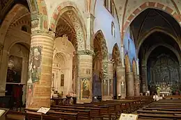 The wide interior is on the Latin cross plan, divided into a nave and two aisles with four spans each; there are also side chapels. The nave and the aisles are cross-vaulted, separated by ogival arches supported by large brickwork columns. Walls and columns are decorated by numerous frescoes dating from the 14th to the 18th century; among the many 14th century ones, particularly renowned are the Madonna with Child, Saints and Antonio Fissiraga from an unknown Lombard master.[1] In the right aisles are 16th-century frescoes depicting Madonna with St. Francis, St. Bonaventure and a Donor by the local painter Sebastiano Galeotti, a collaborator of Callisto Piazza.