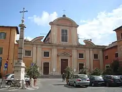 The square in front of the church has one Ionian column erected by Pope Pius IX, taken from the ruins of Veii.