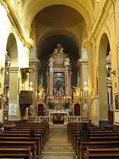 In the first chapel of the right, there are frescoes by Fra Emanuele da Como and monument to Cardinal Michelangelo Ricci by Domenico Guidi. In second, Domenico Maria Muratori frescoed events from the life of ‘’San Giovanni from Capestrano’’ (1725). In the third chapel, is an altarpiece (1685) by Stefano Maria Legnani. In the transept is the chapel of the Rospigliosi-Pallavicini, started by Nicolas Michetti and completed by Ludovico Rusconi in 1725. Inside the altarpiece depicts San Pietro d' Alcantara and San Pasquale Baylon painted by Tommaso Chiaro and the funeral monuments of Stefano and Lazzaro Pallavicini, Maria Camilla, and Giambattista Rospigliosi based on designs of Michetti. The main altar was completed in 1746. The Saint Francis is attributed to Fra Diego da Careri, the Trinity canvas by Paris Nogari.