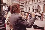Nightclubs across the city increasingly featured jazz fusion artists who moved away from traditional jazz, embracing a range of influences including Brazilian musical forms; bongo playing for instance became one of the musical icons of the city during this period. Keystone Korner in North Beach was a notable jazz club which opened in 1972, featuring jazz greats like Miles Davis, McCoy Tyner, Betty Carter and others.[24] Another popular nightclub of the 1970s which opened in 1972 was Dave Allen's The Boarding House, which hosted music and comedy, featuring Bette Midler, Patti Smith, Dolly Parton, Steve Martin, Robin Williams, and others.[25] In the 1970s, the rise of disco was one of the biggest musical genres of the decade (rooted in funk, Latin and soul vocal music supported by bass lines and electronic synthesizers). Disco took hold in the San Francisco gay community in the early 1970s and by 1978 the androgynous San Francisco singer Sylvester had achieved national prominence with several disco hits.[26]
