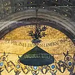 The upper part features a perspective coffered ceiling, flanked with pillars which are copies of the real ones at the original altar. Behind the Madonna is a dark niche. In the latter's half-dome is a gilt mosaic decoration in the Venetian style.