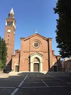Church San Giulio has a Romanesque Revival and Lombard architectural style, and its front side faces the main square of the town of Castellanza.[2] The key features of the north Italian Lombard Romanesque architectural style are brick and flat and wide facades covering the whole front of the church, often with a big rose window in the middle, above the entrance.[3] The presbyterian pavement (architecture) was built in 1932 and is made of Venetian marble in a mosaic structure. In the pavement are represented geometric figures, and in the middle of these figures is a figure made by squares, with sides of 143 cm.