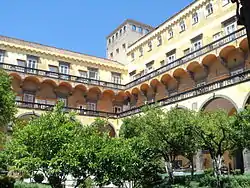 The construction of the church was begun in 1574, using designs by Giovanni Battista Cavagni, and consecrated five years later. A later consecration dates to 1674, and refurbishment to 1762.[1] The façade has three arcades surmounted by four pilaster strips in Tuscan order. The interior has a single nave with five side arcades: the decoration, with the exception of the five chapels, was finished by Luca Giordano (also author of the Saints over the windows of the dome) in 1679. Bernardino Lama, likely the son of Giovanni Bernardo Lama, was author of the altarpiece. The interior houses also the famous Holy Staircase, used by the nuns during their penitences.