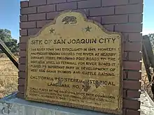 San Joaquin City (Spanish: San Joaquín, meaning "St. Joachim") is a former settlement in San Joaquin County, California. It was established in 1849, during the California Gold Rush.[2] It was located on the west bank of the San Joaquin River just below the point where Airport Way (formerly Durham Ferry Road) crosses the river today. It was an important settlement along the old River Road (now Kasson Road in San Joaquin County) between Banta and Grayson's Ferry (now the community of Grayson in Stanislaus County.[3]