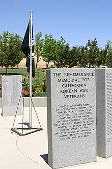 - The California Korean War Veterans Memorial, erected in 1998. It consists of 16 five-foot-tall (1.5 m) granite monoliths arranged in a circle. Engraved on each monolith is the name of the 2,495 veterans from California who died during the Korean War.
