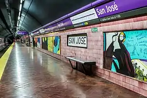 San José is a station on Line E of the Buenos Aires Underground. The old station San José vieja was closed the year the current station opened, after the line was re-routed from Constitucion railway station to its current trajectory.[1] The station was opened on 20 June 1944 as the eastern terminus of the inaugural section of the line from San José to General Urquiza. On 24 April 1966 the line was extended further east to Bolívar.[2]