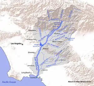 San Jose Creek is an intermittent, tributary stream of the San Gabriel River in Los Angeles County, California. The mouth of San Jose Creek is at an elevation of 194 feet (59 meters) at its confluence with the San Gabriel River, 3.5 miles (5.6 km) southwest of Bassett, California. Its source is at 960 feet near the Los Angeles County Fairplex, at 34°04′50″N 117°45′38″W, where it has its confluence with Thompson Wash,[1] actually a continuation of the creek into the San Gabriel Mountains. From Thompson Wash, San Jose Creek flows nearly 20 miles (32 km) westwards from Pomona into the San Gabriel River through the Pomona Valley and San Gabriel Valley.[2]