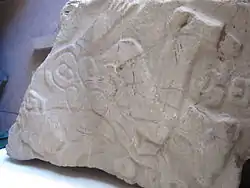 A flat, carved stone, designated Monument 3, was placed as a doorstep to the ceremonial structure (Price and Feinman 2005, p. 321). The carving is of a naked man with "a puffy, slitted eye, lips drawn back in a grimace, overall posture of vulnerability ... rounded elements on the chest and abdomen suggesting the guts after disembowelment."[5] Glyphs depict drops of blood and a possible calendar day-name "1 Earthquake." These are the earliest Zapotec glyphs known to exist. While personal bloodletting was suggested by the stingray spines and similar objects made of obsidian or jade, the figure depicted on Monument 3 shows sacrifice of a victim, probably a captive, on a societal level.[5] In a later time period, monuments carved with similar figures, called danzantes (dancers), were present at Monte Albán.[6]