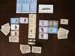 The cards, each of which depict a building and describe its ability, serve multiple purposes: A card in a player's hand is, at the same time, both money used for building, and a potential building to be built. Additionally, the cards are used to represent goods produced in any Production building.