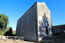 The church was originally documented as an Augustinian hermitage in 1119, located near the Lake Verano, now known a Pian del Lago. An abbey was established over the next centuries. The church underwent reconstruction during 13th and 14th centuries, gaining a style transitioning between romanesque and gothic. In 1366, the convent was fortified to protect against raiding armies. The tall stone facade has a round oculus but a rounded arch portal. The lateral walls have few but narrow windows.