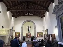The main altarpiece presently is a 15th-century triptych by Lorenzo di Niccolò, depicting an Enthroned Madonna and Child flanked by depictions of Saints Anthony Abbot, Leonard, James the Apostle, and Lawrence. Another altarpiece depicts Archangel Raphael with Tobias, St Leonard, and St Sebastian (circa 1478) by followers of Neri di Bicci. Two altarpieces are attributed to Neri di Bicci: including a Madonna of the Assumption grants a belt to St Thomas, flanked by Saints Peter, Jerome, Francis, and John the Baptist. Cosimo Ulivelli painted some frescoes in the apse.[1]
