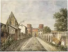 In the eighth century, the anonymous pilgrim of Einsiedeln pointed out that there existed a church dedicated to the Egyptian martyr Saint Menas on the Ostian Way, a little before reaching the Basilica of Saint Paul.[1][2] The church was connected to the famous portico that led from Porta San Paolo into the Ostian Basilica, as is evidenced from the pilgrimage itineraries of the seventh century: inde per porticum usque ad ecclesiam Mennae, et de Menna usque ad s. Paulum Apostolum.[1][2][note 1] A precise location for the church may be next to a small bridge (ponticello) along the porticus that spanned the Almone, a small river that used to flow into the Tiber from the east, but is today diverted.[3]