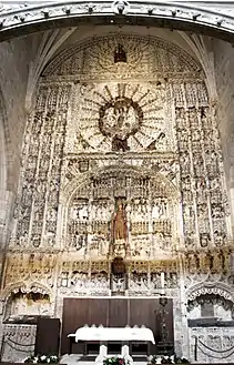 This main altarpiece was financed by the Burgos merchant Don Gonzalo Lopez de Polanco prior to his death in 1505. The work measures 15.55 by 9.04 meters and is made of a porous limestone from Hontoria de Cantera, a small town in the province of Burgos. This type of stone was often used in the construction of buildings, including the Cathedral of Burgos and the Monasteries of San Pablo but was seldom used for altarpieces.[2]