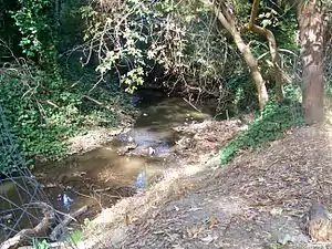 The creek runs from the southeast to the northwest, originating near Orinda and flowing into San Pablo Bay. It drains one of the largest watersheds in the East Bay, comprising some 41 square miles (110 km2).[4] The creek has 34 named tributaries.[5] The creek was dammed in 1919,[6] forming the San Pablo Reservoir. Briones Reservoir, constructed in 1964, dams the Bear Creek tributary.[5] San Pablo Reservoir essentially splits the creek in two, with about half of the creek and its related feeder creeks on either side of the artificial lake; for much of its course, it runs parallel to Wildcat Creek, which drains from Wildcat Canyon, the next valley to the west.[4][5] The East Bay Municipal Utility District (EBMUD) gets less than 10% of its water from the creek.[7]