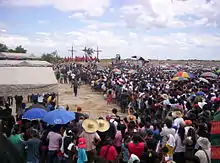 It includes a passion play culminating with the actual nailing of at least three penitents to a wooden cross atop the makeshift Calvary.