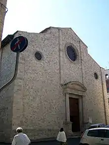 The church was begun by the Dominican order in 1280, recalling the 1250 visit to Ascoli of Brother Pietro da Verona. Construction continued until the 16th century. The travertine block façade has three rounded oculi and a single portal with two flanking columns extending from a rounded pediment. The façade portal was designed by Giuseppe Giosafatti (1643–1731). The lateral portal faces the piazzetta and has doric columns (1523), designed by Cola dell'Amatrice.