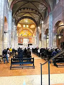 In the 1570s, in compliance with the dictates of the Council of Trent, the numerous sarcophagi and funeral monuments that crowded the basilica were removed, also creating a certain embarrassment during liturgical functions. With the exception of the remains of king Liutprand, most of the mortal remains found during the 19th-century restorations were buried below the main nave, near the penultimate pillar before the crypt, as recalled by an epigraph inserted in the floor.[9]
