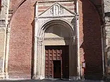 The basilica remained the main sepulchral church of the Visconti court in Pavia until the foundation of the Certosa: between 1384 and the beginning of the 15th century, Francesco d'Este, the eldest daughter of Gian Galeazzo and Caterina Visconti, Violante Visconti and the condottiero Facino Cane.[5] Also in the same years, the basilica was visited by diplomats and ambassadors visiting the court of Galeazzo II, such as Geoffrey Chaucer in 1378.[6] In 1525 the Landsknechte captain Eitel Friedrich III, count of Hohenzollern and Richard de la Pole, pretender to the English crown, who died during the battle of Pavia, were also buried in the basilica.[7][8]