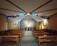 The church is modernist in style, with a side chapel devoted to Padre Pio, with a painting of him by Ulisse Sartini. The main altar features a bronze crucifix by Publio Morbiducci, while the pipe organ (added in 1969, and so not seen in The Last Man on Earth) was made by the Tamburini firm.[7]