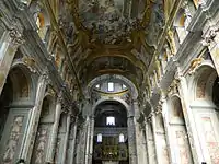 On the 16th century pavement, many tombs are found, including that of Belisario Corenzio, who died in a fall from the scaffolding while he frescoed the vault of this church.[23] After much of the ceilings collapse in the 1731 earthquake, they were refrescoed by Francesco De Mura, who also painted the counterfacade (1739) and Giovanni Paolo Melchiorri, who painted the choir ceiling with a Glory of St Benedict.[24] The stucco of the nave was completed by Giuseppe Scarola. The Sacristy conserves a complete cycle of frescoes by Onofrio De Lione, brother of Andrea and student of Corenzio. Onofrio painted the Old Testament Scenes (1651). The Trinity fresco was painted by Corenzio
