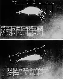 The 46 cm (18.1 in) Sanshiki Model 13 round weighed 1,360 kg (2,998 lb) and was filled with 900 incendiary tubes and 600 steel stays. The round was equipped with a delay fuze set before firing that detonated the shell at the set altitude; on explosion, the steel stays and the incendiary tubes were ejected in a 20-degree cone forward, with the shell fragments from the explosion itself further increasing the amount of debris. The incendiary tubes ignited about a half-second later and burned for five seconds with five-metre (16 ft) long flames.[1] Each of the incendiary tubes was a 90 millimetres (3.5 in) long, 25 millimetres (0.98 in) diameter hollow steel cylinder, filled with rubber thermite (phosphorus, vulcanized rubber, natural rubber, stearic acid, sulphur and barium nitrate) and ignited through holes on both sides. The rounds were similar to conventional shells, except for their wood-filled ogive and several layers of assembled fragments.